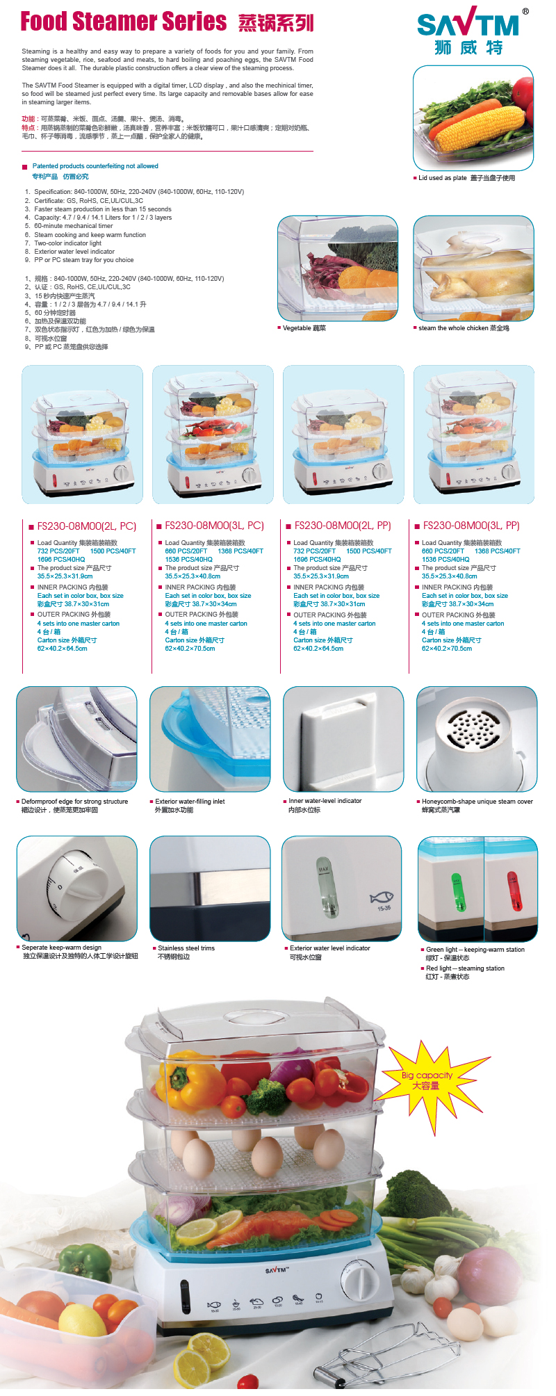 steaming vegetable, rice, seafood and meats, to hard boiling and poaching eggs, the SAVTM Food Steamer does it all. The durable plastic construction offers a clear view of the steaming process. The SAVTM Food Steamer is equipped with a digital timer, LCD display , and also the mechinical timer, so food will be steamed just perfect every time. Its large capacity and removable bases allow for ease in steaming larger items. 功能:可蒸菜肴、米饭、面点、汤羹、果汁、煲汤、消毒。 特点:用蒸锅蒸制的菜肴色彩鲜嫩,汤真味香,营养丰富;米饭软糯可口,果汁口感清爽;定期对奶瓶、 毛巾、杯子等消毒,流感季节,蒸上一点醋,保护全家人的健康。 Patented products counterfeiting not allowed 专利产品 仿冒必究 1. Specification: 840-1000W, 50Hz, 220-240V (840-1000W, 60Hz, 110-120V) 2. Certificate: GS, RoHS, CE,UL/CUL,3C 3. Faster steam production in less than 15 seconds 4. Capacity: 4.7 / 9.4 / 14.1 Liters for 1 / 2 / 3 layers 5. 60-minute mechanical timer 6. Steam cooking and keep warm function 7. Two-color indicator light 8. Exterior water level indicator 9. PP or PC steam tray for you choice 1、规格:840-1000W, 50Hz, 220-240V (840-1000W, 60Hz, 110-120V) 2、认证:GS, RoHS, CE,UL/CUL,3C 3、15 秒内快速产生蒸汽 4、容量:1 / 2 / 3 层各为4.7 / 9.4 / 14.1 升 5、60 分钟定时器 6、加热及保温双功能 7、双色状态指示灯,红色为加热/ 绿色为保温 8、可视水位窗 9、PP 或PC 蒸笼盘供您选择 |